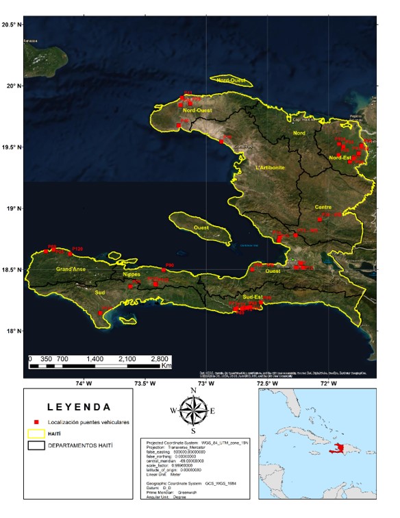 Localización de 33 puentes vehiculares seleccionados para el proyecto.Fuente: MTPTC (Ministère des Travaux Publics, Transports et Communications)