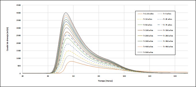 - Modelo de tránsito: cálculo de tiempo de viaje del volumen de escorrentía a los 33 puentes.