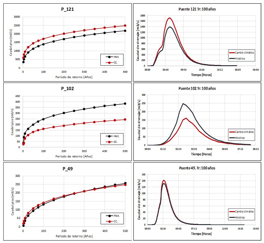A partir del análisis comparativo de los resultados de caudal pico entre el escenario histórico y futuro, se deducen tres tipos de resultados: incremento, decrecimiento y sin cambio. Del total de 33 puentes, en términos del cambio de caudal pico a futuro en relación con el histórico, 15 (45%) puentes incrementan su caudal, 2 (6%) puentes permanecen sin cambios y 16 (48%) puentes disminuyen su caudal.