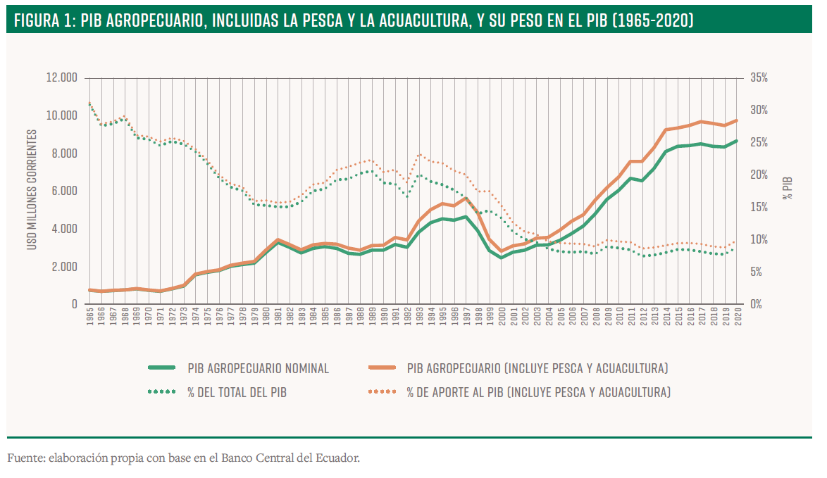Las actividades agropecuarias, de pesca y acuacultura en Ecuador son sectores productivos de relevancia histórica para el desarrollo económico, la generación de empleo, la seguridad alimentaria y la inserción del país en el comercio internacional. Entre 2011 y 2021, el sector agropecuario representó el 8,1% del PIB, con un crecimiento anual promedio de 2,3%, mientras que la acuacultura y la pesca representaron un 1,1% del PIB, y tuvieron un crecimiento promedio anual de 9,2%. No obstante, a partir de 2017, el sector agropecuario experimentó una disminución en su crecimiento promedio anual, lo que se agravó con la llegada de la pandemia del COVID-19 en 2020. En contraste, las actividades de acuacultura continuaron creciendo, llegando incluso a sobrepasar las exportaciones de petróleo sin refinar en los primeros meses de 2023, impulsadas principalmente por la demanda de camarón en China, alcanzando incluso en los primeros meses del 2023 a sobrepasar las exportaciones de petróleo sin refinar, de acuerdo con el Banco Central de Ecuador (BCE).