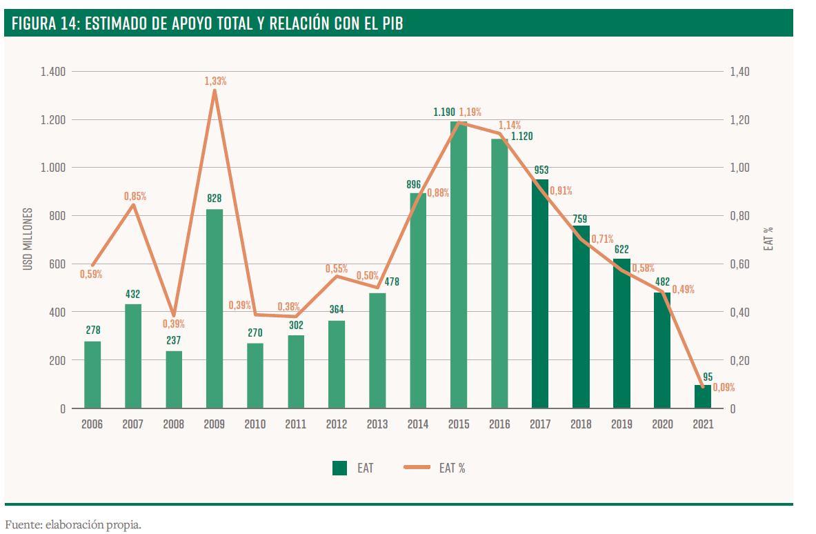 El Estimado de Apoyo al Productor representó, en promedio, el 6,59% de los ingresos percibidos por el sector agropecuario en 2017-2021, lo que se compara con el 9,10% del período 2013-2016, inferior en ambos casos al promedio de América Latina y el Caribe (12,5%), y sustancialmente menor que el nivel de apoyos brindados en los países de la OCDE (18%). El apoyo vía precios estimado para el período 2017-2021 promedió US$475 millones, lo que implicó una reducción del 27% respecto del valor promedio del período 2013-2016.