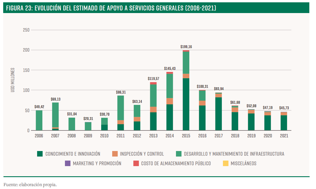 El Estimado de Apoyo a Servicios Generales mide el apoyo presupuestario a bienes públicos para el sector agropecuario. El promedio para el periodo 2017-2021 fue de US$59 millones, comparado con el promedio de US$140 millones del período 2013-2016, lo que representa una reducción del 58%. La evidencia empírica como Anriquez et al (2016) sugiere que el gasto público agropecuario aumenta el crecimiento del sector, pero la priorización de bienes públicos en la composición del gasto es clave para el desempeño agropecuario. Además, FAO (2021) confirma que es esencial reducir gradualmente algunos tipos de Apoyo Directo a los productores, o sea, los incentivos de precios y subsidios fiscales vinculados con rubros específicos, que son generalmente más distorsionantes y perjudiciales para el medioambiente. Al mismo tiempo, esos recursos deberían redirigirse hacia la provisión de bienes y servicios públicos para la agricultura, como investigación, sanidad e infraestructura.