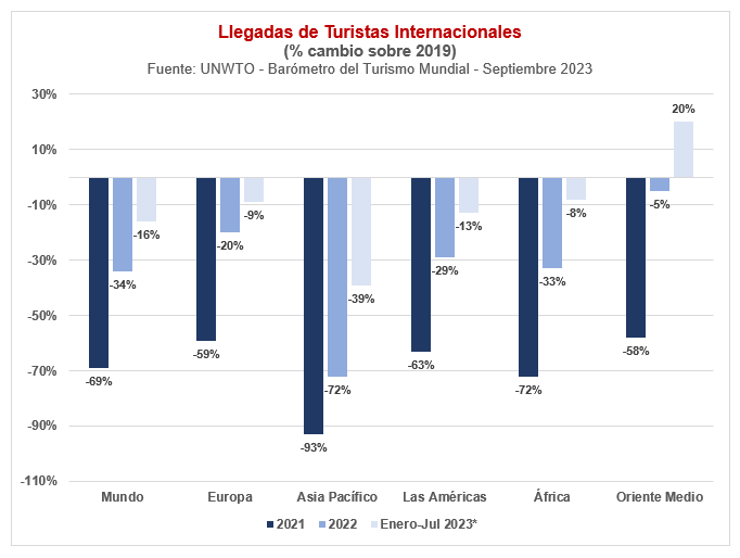 Recientemente, la Organización Mundial de Turismo (UNWTO, por sus siglas en inglés) nos anunciaba que nos estábamos acercando a la recuperación plena. Entre enero y julio de 2023, el número de llegadas internacionales alcanzó el 84% respecto al nivel prepandemia. Oriente Medio lidera la recuperación, habiendo superado notablemente los niveles de 2019 (120%), seguido de África (92%) y Europa (91%). Las Américas se sitúa en el 87%, y Asia y la Región del Pacífico en el 61%.