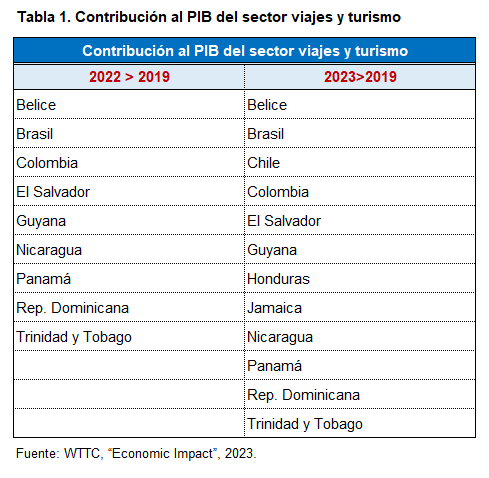 - Del conjunto de los 26 países prestatarios del BID, aproximadamente un tercio lograron en 2022 alcanzar o superar en términos reales el nivel de contribución prepandemia del sector de viajes y turismo al PIB (9 de 26 países, ver “Tabla 1”).
