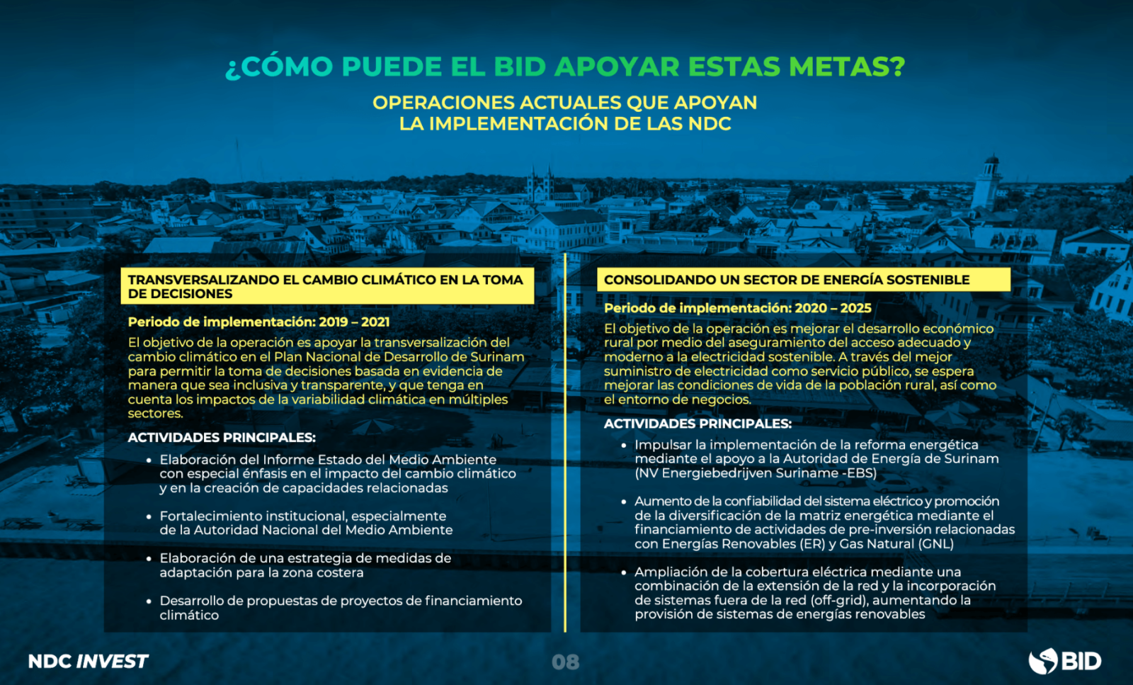 A pesar de los grandes retos por delante para reactivar y diversificar la economía, así como para mejorar las condiciones de vida de la población, la actualización de las NDC es una señal de que en Surinam se están dando los pasos correctos. El liderazgo mostrado por el país en la definición de su NDC se espera se traduzca en acciones concretas para la recuperación sostenible y resiliente. Sin duda la acción conjunta con aliados estratégicos como el BID será sin lugar a duda indispensables para lograr estas metas.