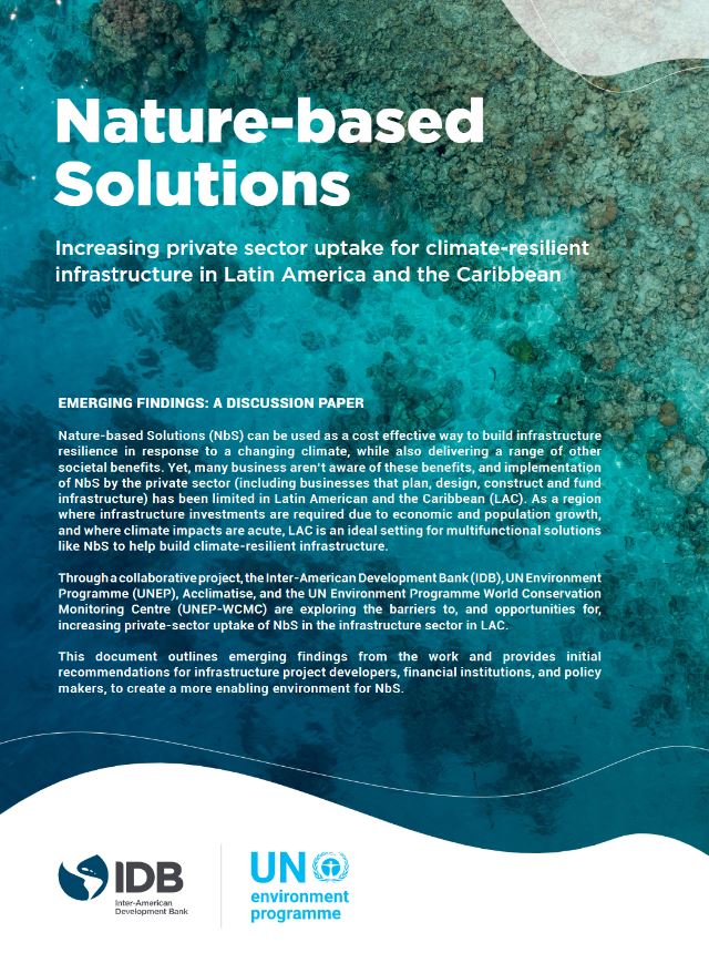 Las soluciones basadas en la naturaleza (NbS) son una forma rentable de construir infraestructura resistente a un clima cambiante, al tiempo que ofrecen otros beneficios sociales. LAC es un escenario ideal para soluciones multifuncionales como NbS para ayudar a construir una infraestructura resistente al clima. A través de un proyecto de colaboración, el Banco Interamericano de Desarrollo (BID), el Programa de las Naciones Unidas para el Medio Ambiente (PNUMA), Acclimatise y el Centro de Monitoreo de la Conservación Mundial del Programa de las Naciones Unidas para el Medio Ambiente (PNUMA-WCMC) están explorando las barreras políticas, técnicas y financieras para, y oportunidades para aumentar la absorción del sector privado de NbS en el sector de infraestructura en ALC. Esta publicación presenta hallazgos emergentes y proporciona recomendaciones para desarrolladores de proyectos de infraestructura, instituciones financieras y formuladores de políticas para crear un entorno más propicio para NbS.