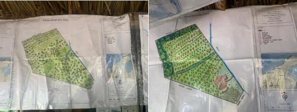 La planificación predial participativa en acción: finca actual y finca soñada. Visita de Campo 2024-I. Proyecto de restauración ACT-FCS. Foto de los autoresEn el marco de este proyecto, se implementó un proceso de planificación predial participativa que incluyó la georreferenciación de los predios, lo que permitió desarrollar planes operativos detallados y específicos para cada finca. Como parte de las acciones clave, se estableció un vivero comunitario, encargado de producir material vegetal nativo necesario para las actividades de reforestación en los predios beneficiarios. A la fecha, se han producido y distribuido más de 22.095 árboles maderables y 2.251 árboles frutales. El proyecto ha definido metas concretas en tres áreas principales: restauración activa (66 ha), rehabilitación (622,4 ha) y restauración pasiva (660,4 ha). Los avances alcanzados al primer semestre de 2024 son del 20,1% en restauración activa, 94,7% en rehabilitación y 100% en restauración pasiva. Las actividades de restauración activa incluyen, entre otras, la protección de fuentes hídricas y la recuperación de áreas degradadas. En cuanto a la rehabilitación, se han implementado sistemas silvopastoriles en zonas ganaderas y sistemas agroforestales en áreas agrícolas. La restauración pasiva, por su parte, se ha centrado en la formalización de acuerdos voluntarios de conservación con los propietarios de los predios.Finalmente, se implementó un plan de monitoreo participativo. (ACT, Informe Semestral de Proyecto 2024-I).