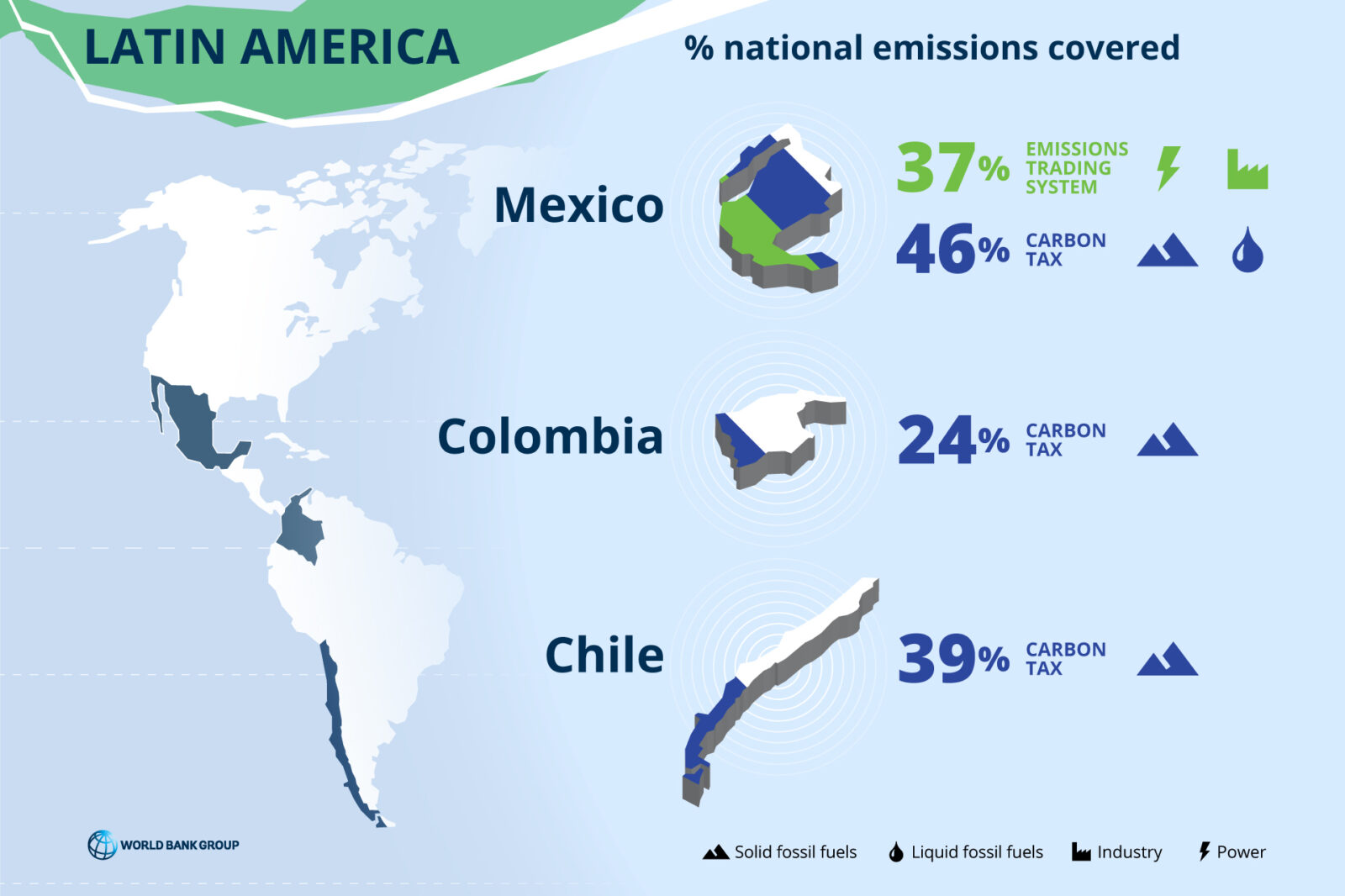 México, Chile y Colombia utilizan un precio al carbono como parte de una estrategia más amplia para descarbonizar sus economías. A principios de este año, México lanzó su programa de prueba del sistema de comercio de emisiones (SCE), el primero de su tipo en América Latina, cubriendo inicialmente los sectores de energía e industria (alrededor del 40% de las emisiones nacionales). La Ley General de Cambio Climático de México, la cual fue reformada para alinearse con los objetivos del Acuerdo de París, establece el mandato legal para este instrumento de política de mitigación. El programa de prueba del SCE tendrá una duración de tres años, lo que dará a los participantes tiempo para familiarizarse con el mercado del carbono, permitiendo a los reguladores probar su diseño general, y enviando a la economía un precio inicial al carbono.