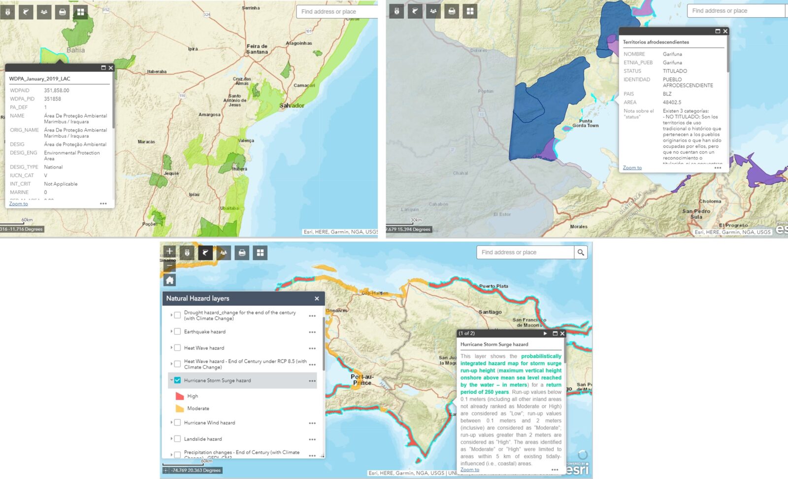 Ejemplos del visualizador de mapas para las tres temáticas: biodiversidad, poblaciones indígenas y afrodescendientes y amenazas naturalesEn el tema de biodiversidad, la herramienta cuenta con información acerca de áreas protegidas, áreas clave de biodiversidad, especies en distintos grados de vulnerabilidad, entre otros. En cuanto a las amenazas naturales, la herramienta contiene un total de 21 capas relacionadas con amenazas naturales geofísicas e hidrometeorológicas, tales como terremotos, deslizamientos, inundaciones, sequías, olas de calor y aumento del nivel del mar, muchos de los cuales muestran también proyecciones de escenarios bajo los efectos del cambio climático según los lineamientos del IPCC.