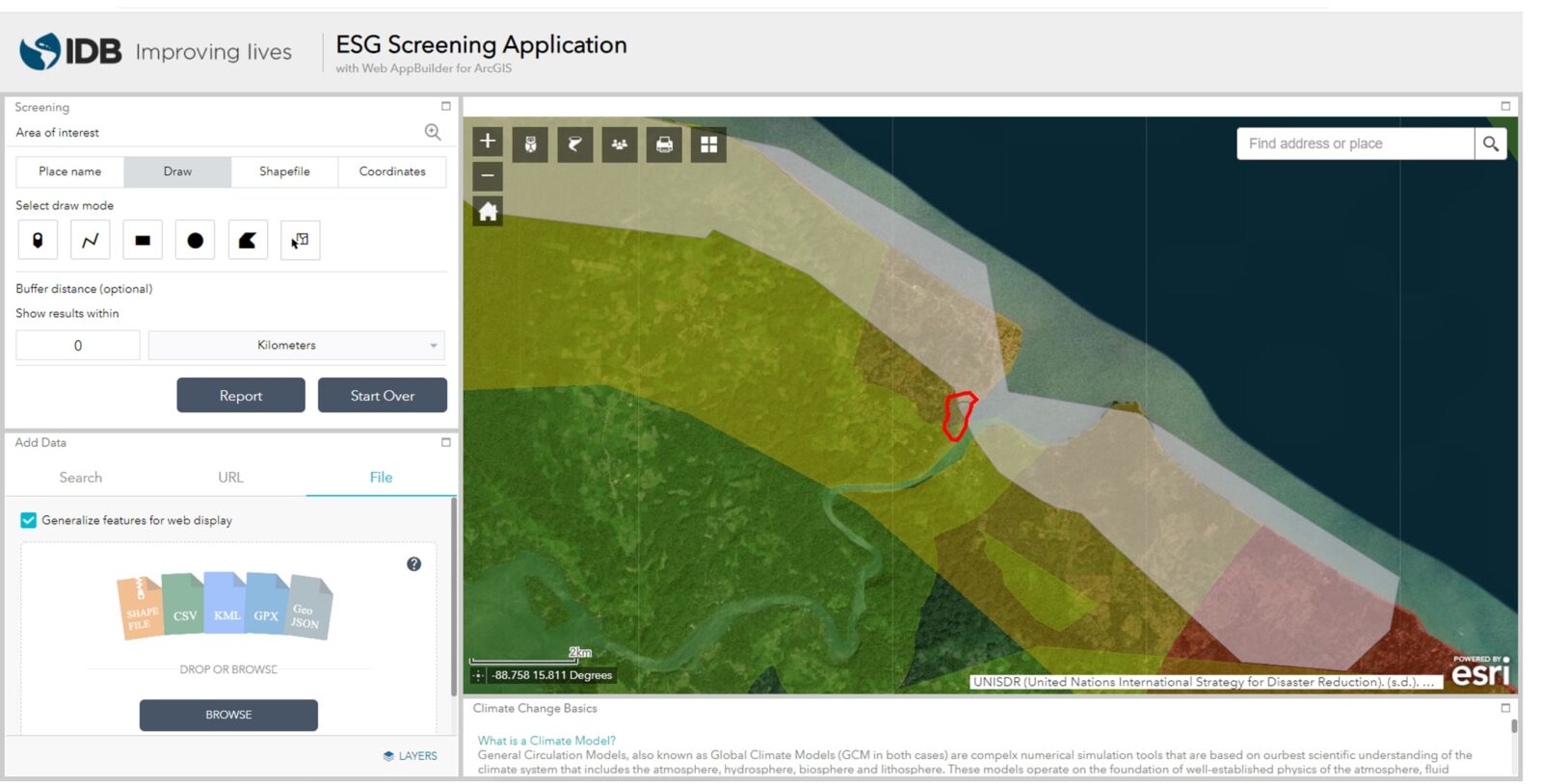 La Unidad de Soluciones Ambientales y Sociales del BID ha desarrollado una aplicación SIG construida en la plataforma ArcGIS Online (AGOL), que incluye capas en un mapa con información relevante sobre biodiversidad, amenazas naturales, y pueblos indígenas y afrodescendientes en América Latina y el Caribe. La información se obtiene de diversas fuentes y está en constante ampliación y actualización.