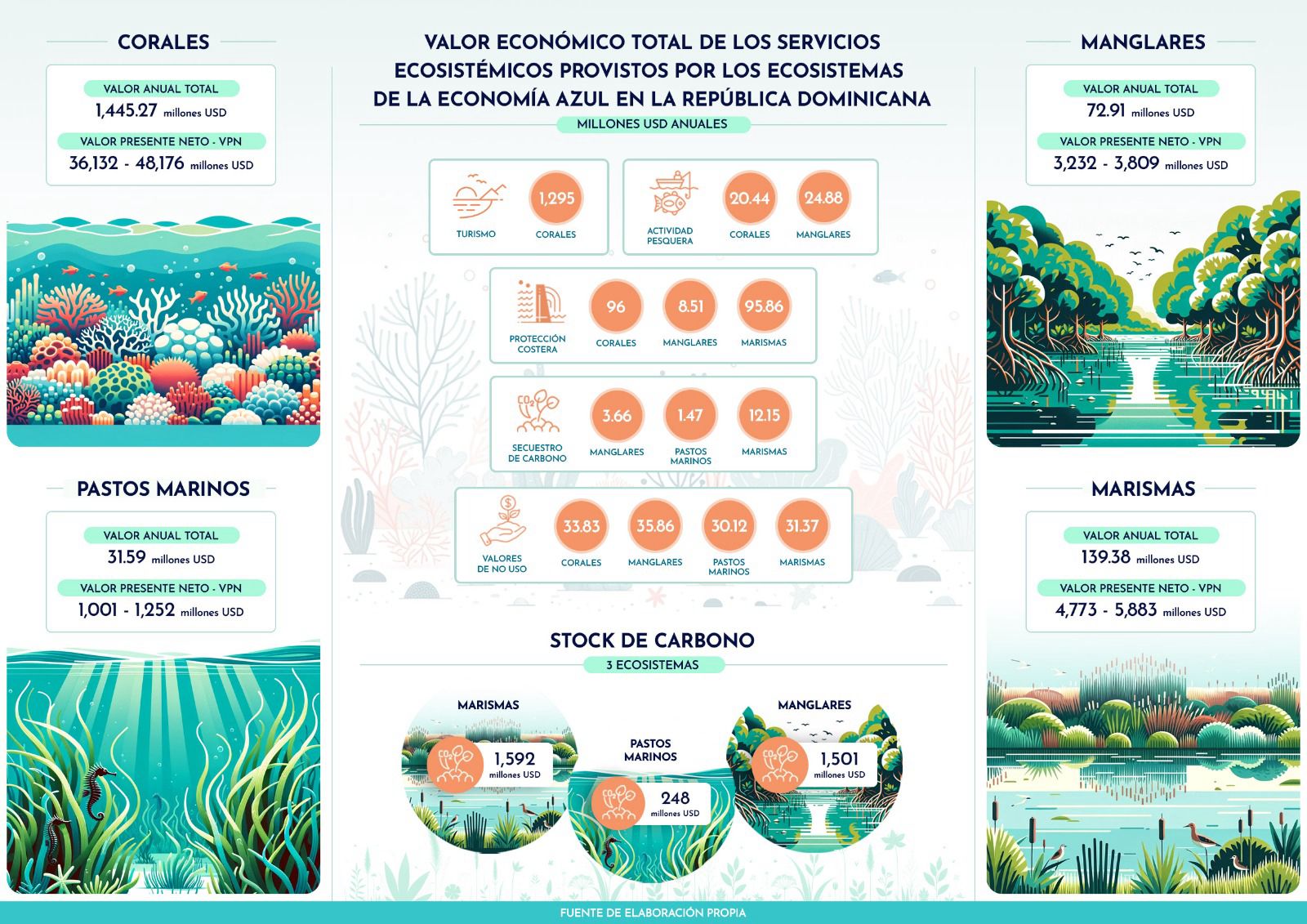 Esta valoración se deriva de un estudio del Banco Interamericano de Desarrollo (BID) titulado “Valoración económica de los servicios ecosistémicos provistos por los ecosistemas de la economía azul en la República Dominicana”. Previsto para publicación en los meses venideros, el estudio busca cuantificar económicamente estos servicios para guiar las políticas de conservación y fomentar la gestión sostenible de los ecosistemas azules dominicanos. En los párrafos siguientes, se detalla la contribución específica de las distintas fuentes a este valor global de US$1.700 millones anuales.