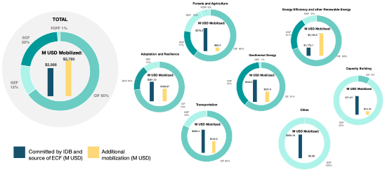 El BID juega un papel importante como socio de fondos externos que invierten en iniciativas bajas en carbono y resilientes al clima, como el Fondo Verde para el Clima (GCF), los Fondos de Inversión para el Clima (CIFs), el Fondo para el Medio Ambiente Mundial (GEF) y el Fondo Cooperativo para el Carbono de los Bosques (FCPF), entre otros. Estas colaboraciones son clave para ayudar a movilizar recursos adicionales y, por su carácter concesional, permiten al BID asumir más riesgos de lo habitual e innovar en métodos y mecanismos para abordar el cambio climático.