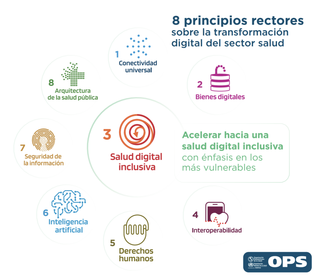 https://vimeo.com/684731273Pero, ¿cómo podemos asegurar que las Estrategias Nacionales de Salud Digital sean inclusivas o resistentes al cambio climático? Mediante el uso de los ocho principios clave de la OPS para la transformación digital del sector de la salud, que son respaldados por todos los países de las Américas, los países pueden verificar si sus estrategias nacionales están alineadas con políticas regionales, incluido el acceso universal a Internet, la incorporación e integración de los derechos humanos, la colaboración en el ámbito de la inteligencia artificial, la seguridad de la información, la interoperabilidad y la sostenibilidad de nuestros sistemas, entre otros. Juntos, proporcionan un marco integral para guiarnos en nuestro viaje de salud digital para asegurar que las estrategias nacionales de salud digital no dejen a nadie atrás.
