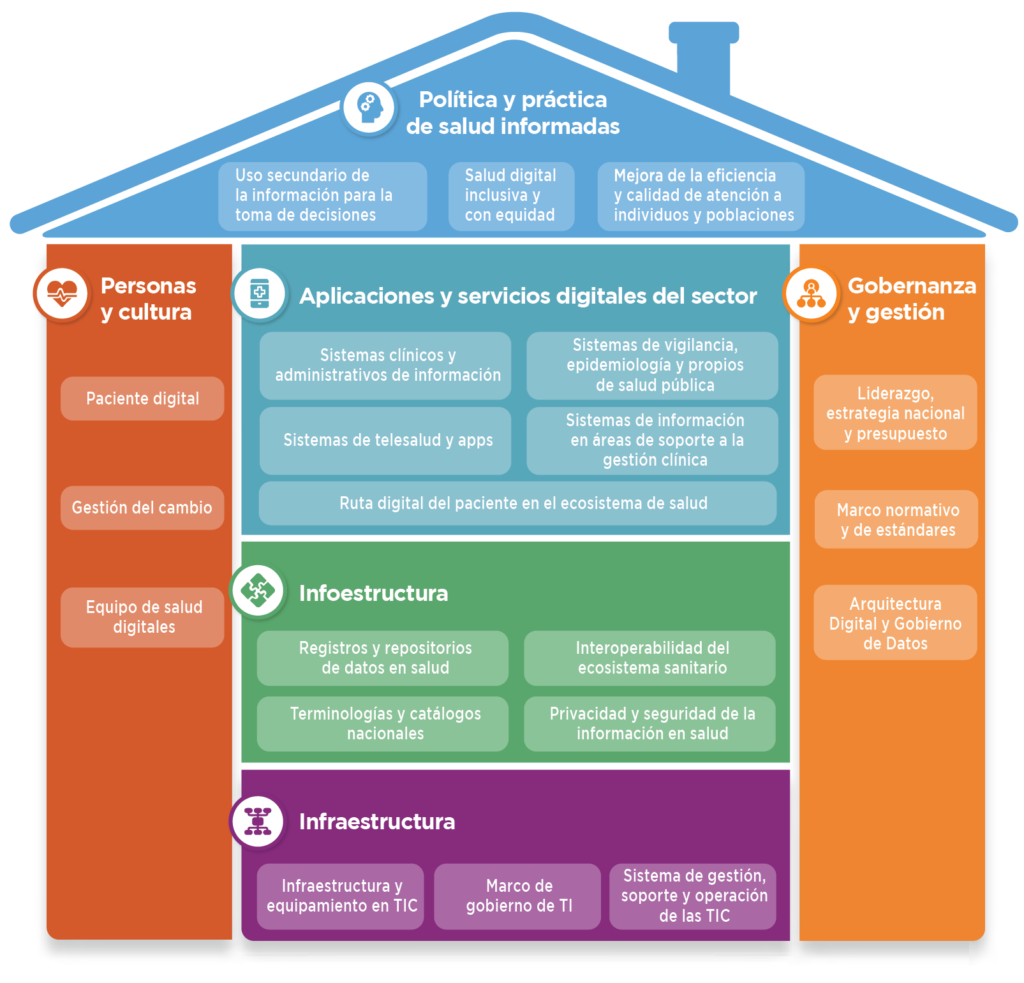 Como se describe en nuestra publicación, tener un enfoque bien definido juega un papel fundamental en dar forma al camino y los objetivos de nuestro viaje de transformación. Para cooperar con este esfuerzo, el BID y la OPS han diseñado un ejercicio práctico para crear agendas y mapas de ruta de salud digital, utilizando las herramientas y el enfoque de los Sistemas de Información para la Salud, junto con la metáfora de una "casa digital". Esta casa digital sirve como representación visual de las acciones y productos necesarios para construir una transformación digital sólida con bases fuertes que incluyen inversiones equilibradas y resultados en seis dimensiones: gobernanza y liderazgo, personas y cultura, política y práctica de salud informadas, infraestructura, infoestructura, y aplicaciones y servicios digitales para el sector.