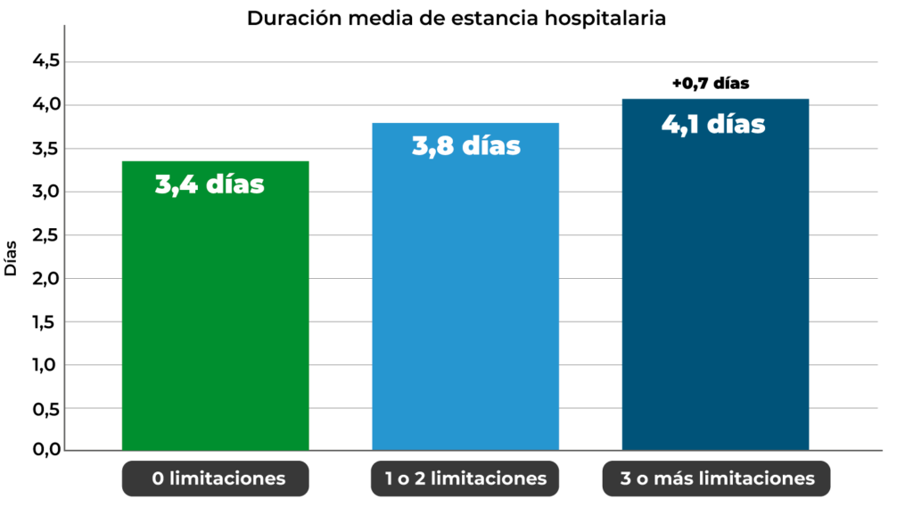 La duración media de la estancia de las personas con una o dos limitaciones en las actividades básicas es de 3,8 días, casi medio día más que las que no tienen limitaciones. Para las personas con tres o más limitaciones, la estancia prevista es de 4,1 días, lo que supone un aumento de 0,7 días en comparación con los que no tienen ninguna limitación y de 0,3 días comparado con los que tienen solo una limitación. Aunque la diferencia media en el número de días de hospitalización entre las personas con y sin limitaciones funcionales puede parecer modesta, menos de un solo día, sus implicaciones son significativas.