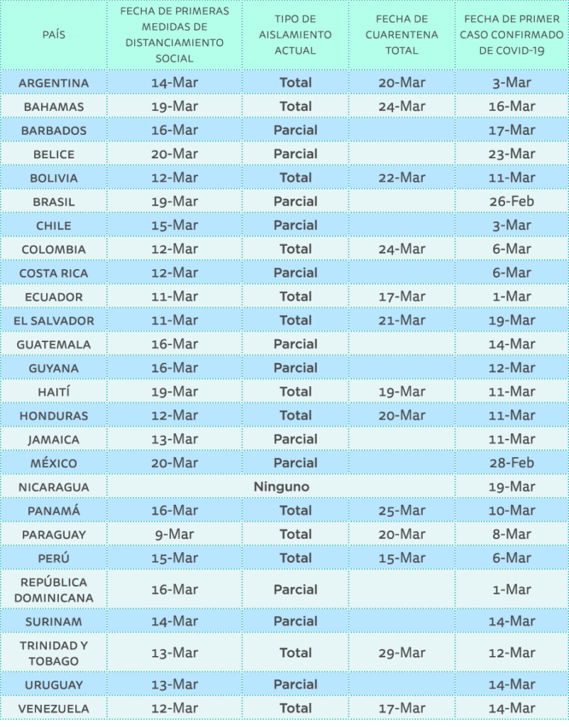 Como vemos en el cuadro, todos los países de la región, a excepción de Nicaragua, han adoptado medidas de aislamiento, total ó parcial. Algunos países, por ejemplo, Ecuador, Paraguay y Panamá, comenzaron por consejos de distanciamiento social y con los casos aumentando significativamente debieron adoptar medidas de aislamiento.