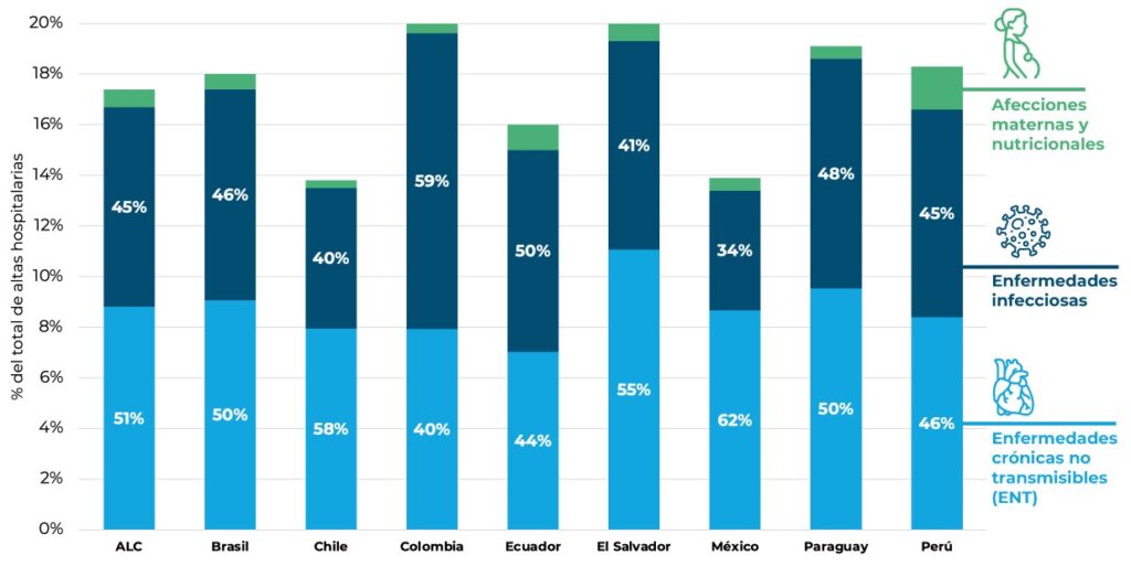 El estudio también revela que las enfermedades crónicas no transmisibles (ENT) —complicaciones de la diabetes, afecciones cardiovasculares y enfermedades respiratorias— representan sistemáticamente más de la mitad de estas hospitalizaciones evitables. Las enfermedades infecciosas son la segunda causa más común de hospitalizaciones evitables, mientras que las afecciones maternas y nutricionales representan una proporción mucho menor, normalmente menos del 5 % en todos los países.