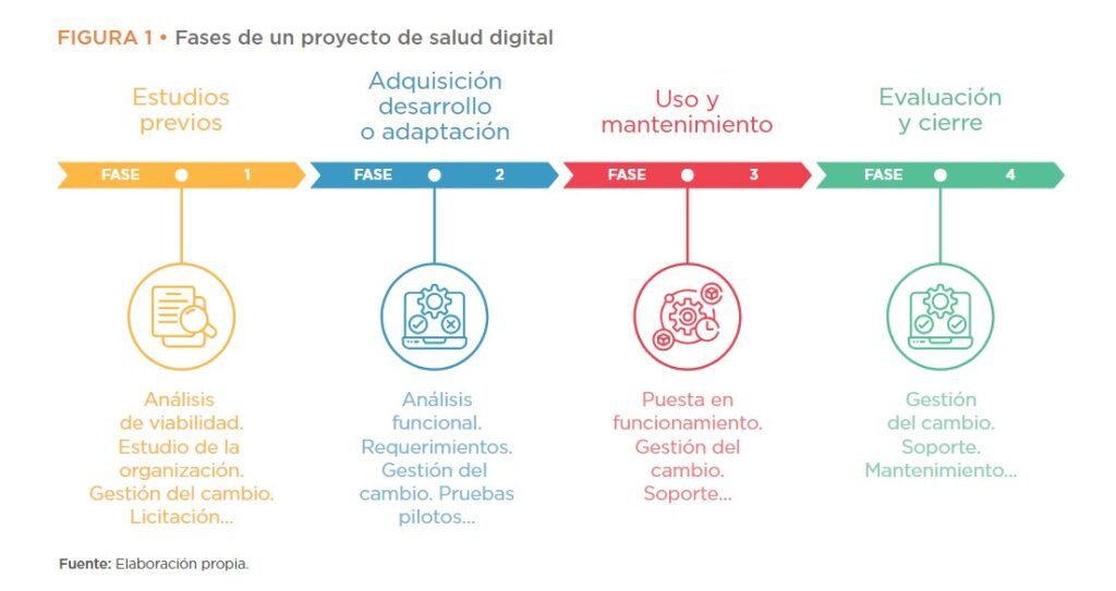 Cuando una persona decide comprar una casa, el costo de adquisición no es el único costo para considerar: como mínimo, debería pensar en los costos de operación (impuestos, servicios) y de mantenimiento (pintura, reparaciones). También, como es una compra a largo plazo, debería pensar la evolución de esa casa en el tiempo: ¿se podría agregar una habitación para un nuevo integrante de la familia, por ejemplo, y cuánto costaría? De la misma forma, un proyecto de salud digital es más que la adquisición o el desarrollo de un software, e implica costos en las cuatro etapas de todo proyecto: la evaluación previa; la adquisición, desarrollo o adaptación; el uso y mantenimiento; y la evaluación y cierre (ver imagen).