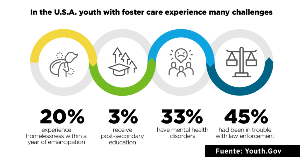 "Jóvenes adultos que han estado en programas de acogida: Desafíos y Soluciones", un informe de Youth.Gov, indica que las y los jóvenes con experiencia en el sistema de acogida en Estados Unidos se enfrentan a retos similares