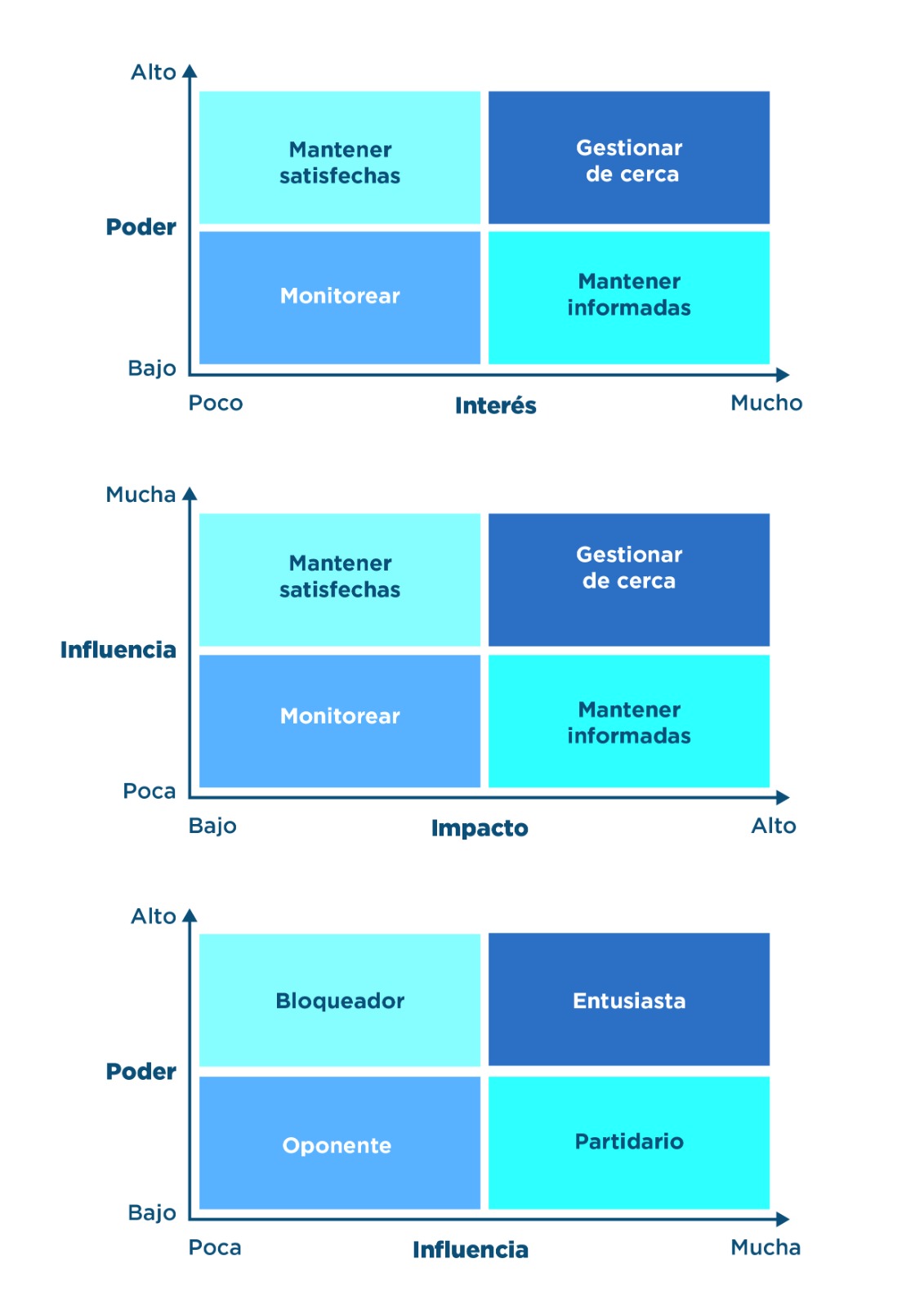 En este contexto, se pueden utilizar algunas herramientas para realizar esta categorización y mapeo de las partes interesadas. Las matrices (1) Poder x Interés, (2) Influencia x Impacto y (3) Poder x Influencia son herramientas poderosas en la gestión de las partes interesadas, ya que ayudan en la evaluación y priorización de éstas y permiten al equipo del proyecto diseñar estrategias dirigidas a los diferentes grupos. El resultado de la interacción de los factores de cada matriz sugiere el tipo de gestión que debe realizarse con cada grupo, como se muestra a continuación.
