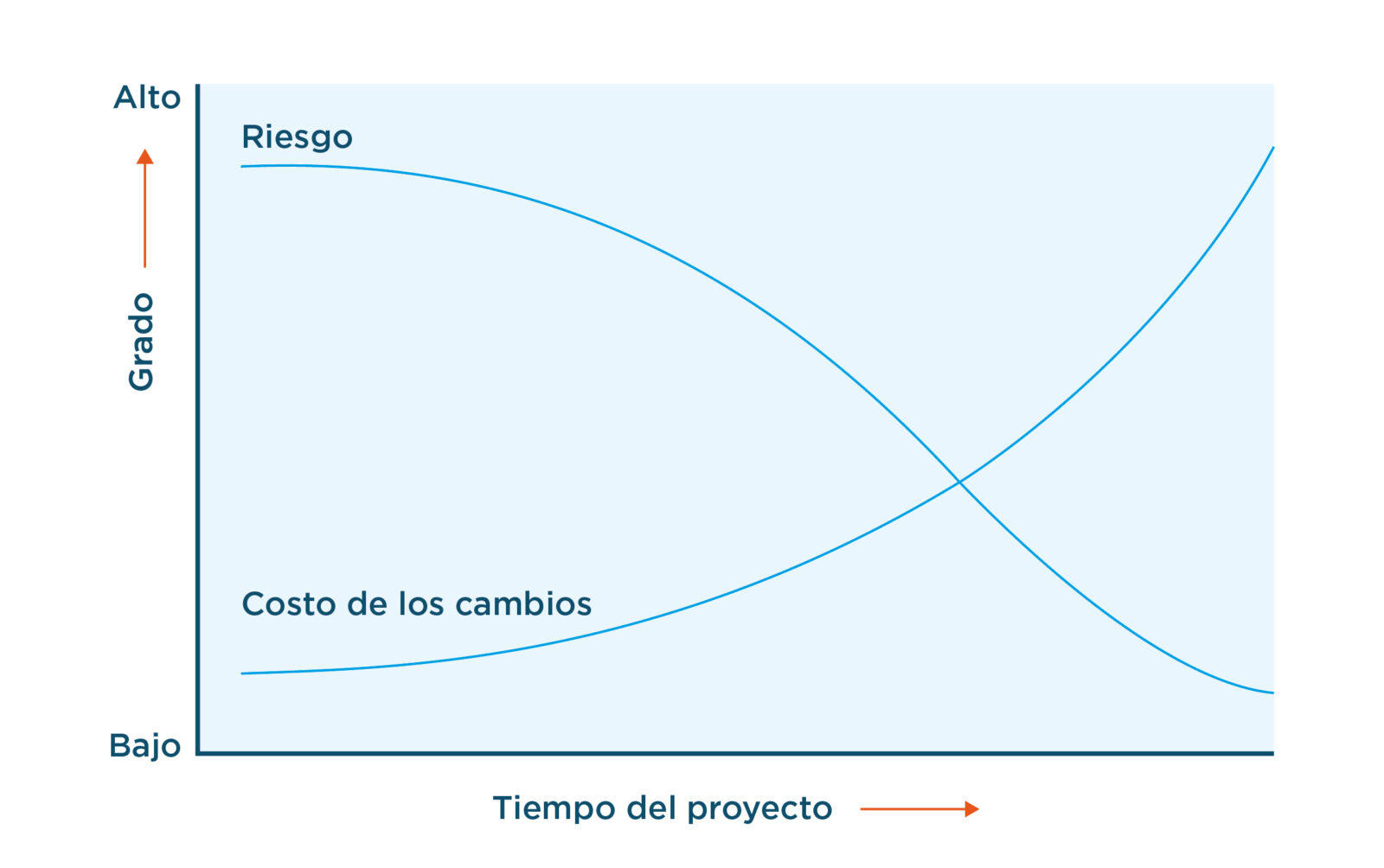 Fuente: GUIA PMBOK® – Sexta ediciónLos cambios son habituales en el contexto de los proyectos y a menudo resultan esenciales para garantizar la obtención de los resultados esperados. Sin embargo, acarrean costes que, si son extremos, pueden hacer inviable la ejecución del proyecto. Por esta razón, el proyecto potencialmente se beneficia cuando los cambios de dirección tienen lugar en las primeras fases de su realización, ya que los costes de su aplicación suelen ser menores.