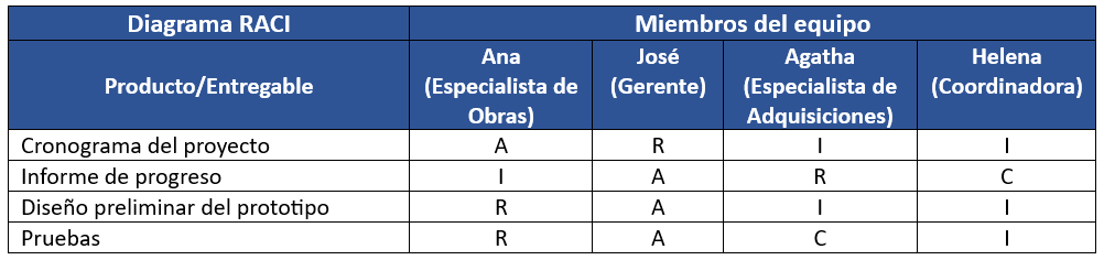 Ejemplo de matriz RACI completada (proyecto ficticio)