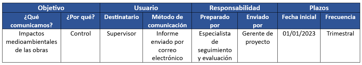 - Responsabilidad: define quién es el responsable de preparar y enviar la comunicación.