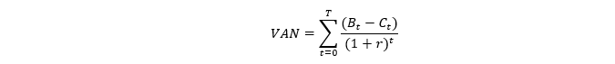 - Valor Actual Neto (VAN): Compara el valor presente de los beneficios futuros esperados con el de los costos incurridos, utilizando una tasa de descuento (r)que refleje el costo de oportunidad del capital para el BID.