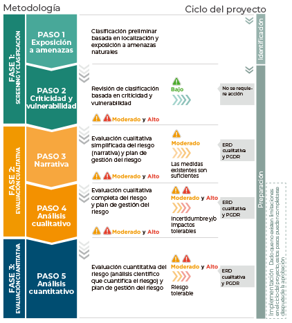 Además, a través de la implementación de nuestro Marco de Políticas Ambientales y Sociales (MPAS), concretamente la Norma de Desempeño 4 (NDAS 4), y nuestra Metodología de Evaluación del riesgo de desastres y cambio climático (DCCRAM, por sus siglas en inglés) se promueve la identificación, evaluación y gestión del riesgo en proyectos de infraestructura con un enfoque por fases que asigna recursos proporcionales a la clasificación de riesgo y complejidad del proyecto. La Metodología del BID se organiza en cinco pasos progresivos: