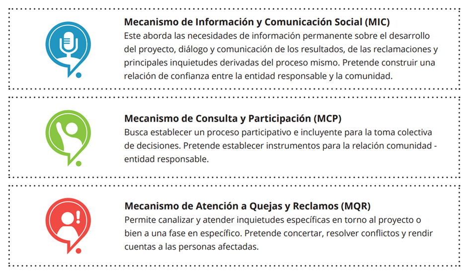 En programas urbanos complejos como éste es fundamental contar con una estrategia robusta de comunicación y participación social. La “Estrategia de Comunicación y Participación Social” (ECPS), desarrollada en el marco de dicho programa, es un referente en el diálogo significativo necesario para poner en marcha iniciativas con fuerte involucramiento de los beneficiarios. La estrategia está basada en la ejecución de tres mecanismos que fortalecen el diálogo, la consulta y la participación de los actores involucrados: el Mecanismo de Información y Comunicación Social (MIC), el Mecanismo de Consulta y Participación (MCP) y el Mecanismo de Atención a Quejas y Reclamos (MQR).