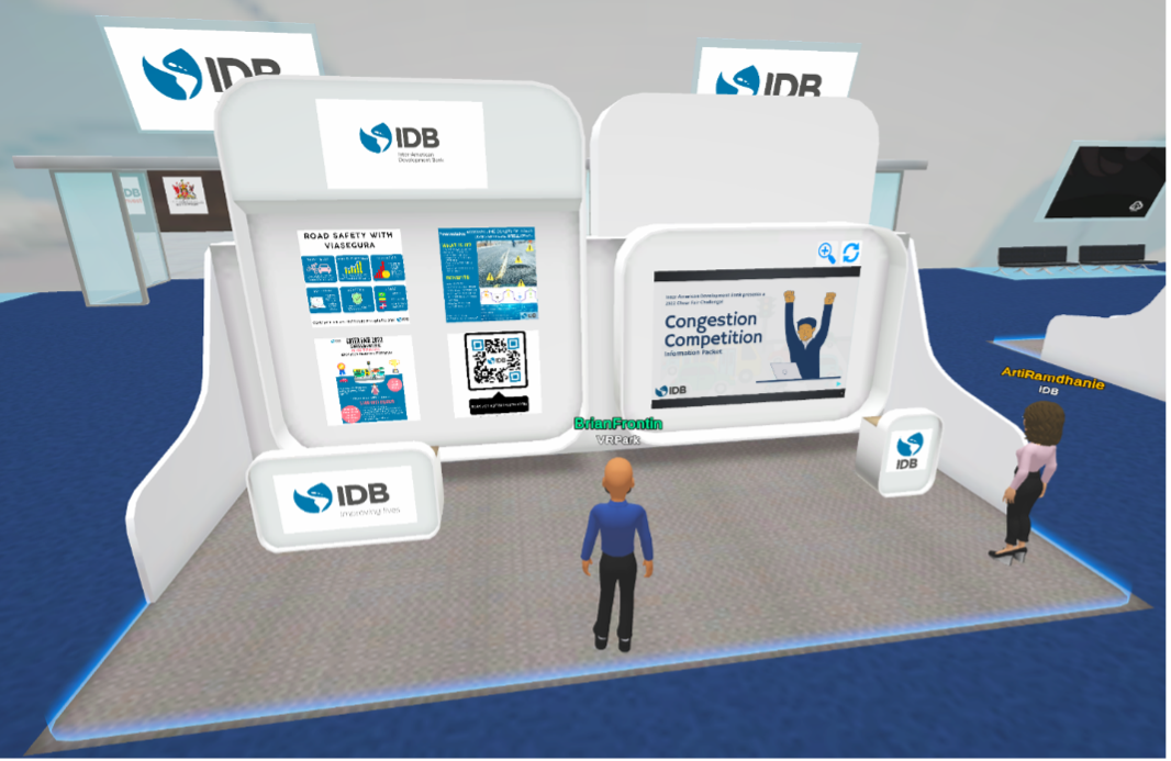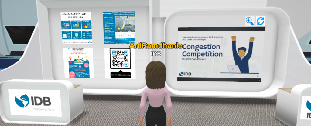 Para la feria se creó una maqueta virtual con salas de reuniones, parques al aire libre y salas de exhibición para que todos los invitados la visitaran. Los asistentes virtuales también incluyeron contrapartes de agencias gubernamentales de Trinidad y Tobago. El BID también creó un stand virtual en la sala de exposiciones donde los niños y otras partes interesadas podían aprender más sobre las soluciones digitales desarrolladas por el equipo, comoViaSegurayPavimentados.