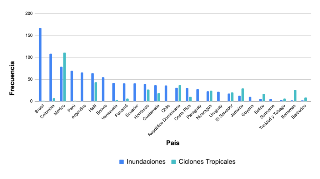 En los últimos años, América Latina y el Caribe ha experimentado un incremento en el número de desastres naturales ocasionados por eventos climáticos extremos. Argentina, Brasil, Colombia, Haití, México y Perú concentran la mayor frecuencia de inundaciones y ciclones tropicales desde 1900 (Figura 1), los dos tipos de desastres naturales reportados con mayor frecuencia en la región.