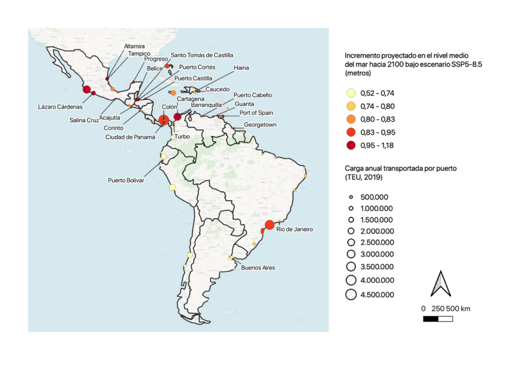 Si no se implementan medidas de adaptación, el CC podría generar importantes amenazas para diferentes modos de transporte de la región. Los incrementos proyectados en el nivel del mar podrían causar inundaciones en diversos aeropuertos costeros, limitando las actividades turísticas y la conectividad de ciertas zonas, especialmente en países insulares. De forma similar, numerosos puertos clave podrían sufrir inundaciones a causa de esta misma variable. Se destacan las implicaciones para la red de transporte marítimo regional por afectaciones en puertos clave como los de Panamá (Figura 2).