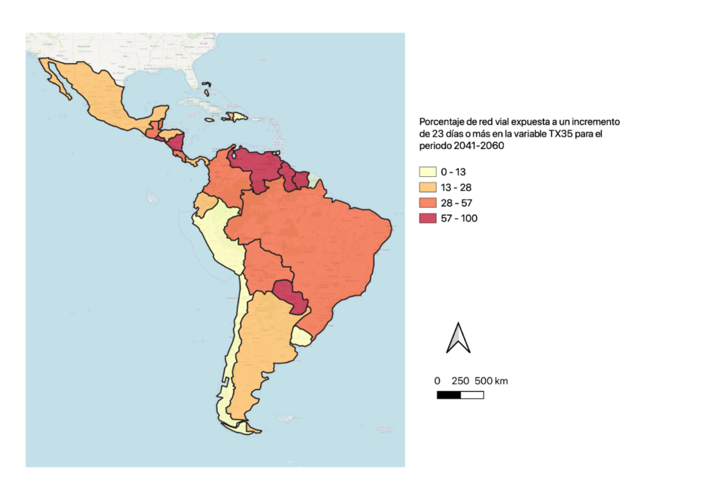 Para las carreteras, se espera que los incrementos en temperaturas extremas aceleren el deterioro de pavimentos, mientras que las precipitaciones extremas incrementan la probabilidad de deslizamientos por saturación del suelo. Las proyecciones indican que la infraestructura vial de países de menor tamaño estará especialmente expuesta a incrementos extremos de temperatura (Figura 3). Por su parte, la red de carreteras del Cono Sur experimentaría los mayores incrementos en la precipitación máxima acumulada durante cinco días consecutivos.