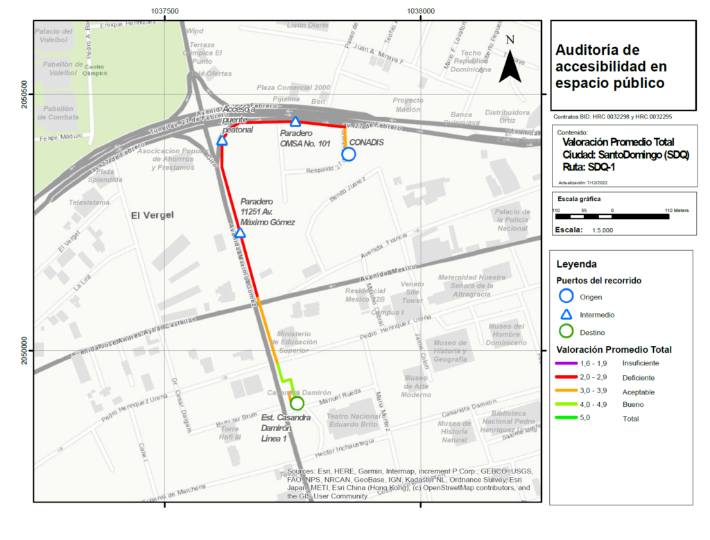 Mapa accesibilidad Estación Casandra Damirón-OMSA 101, Santo Domingo, República Dominicana.Este estudio sienta las bases para que futuros proyectos de infraestructura, enfocados en el desarrollo de aceras, parques, espacios públicos y paradas de transporte, evalúen su nivel de accesibilidad. De esta forma, se podrán identificar oportunidades de mejora y promover la creación de entornos verdaderamente inclusivos y accesibles. Para crear sociedades inclusivas, es crucial avanzar hacia la accesibilidad universal en el transporte y el espacio público. Para ello, es necesario desarrollar competencias en accesibilidad e inclusión entre arquitectos, ingenieros, planificadores y gestores urbanos. Es importante adoptar compromisos y normas vinculantes que aseguren que las obras y sistemas de transporte sean accesibles para todos. Además, se deben establecer mecanismos participativos en la planificación y ejecución de proyectos. Mantener activa la conversación sobre accesibilidad garantizará que, a corto plazo, la accesibilidad universal sea una realidad en los proyectos de infraestructura y transporte.