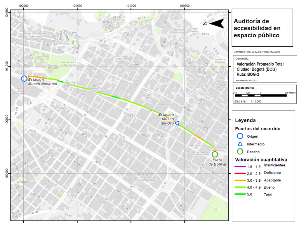 Mapa de accesibilidad Carrera 7, Bogotá, Colombia.Se analizaron aspectos de accesibilidad en las rutas peatonales hacia el transporte público como aceras con un ancho mínimo de 1.20 m, rampas con pendiente menor al 8%, cruces señalizados y elementos de orientación. Diferentes perfiles de personas con discapacidad (física, auditiva, visual y cognitiva) y un auditor especializado calificaron la accesibilidad de cada tramo. Los resultados se transfirieron a la plataforma GIS, y en estos se puede identificar las zonas más y menos accesibles, así como mapas de experiencia por participante. Los resultados del estudio evidencian que las adecuaciones de infraestructura accesible en el espacio urbano y las rutas de transporte, como el desarrollo de aceras amplias, señalizadas y equipadas con rampas, transforman significativamente las posibilidades de movilidad independiente y segura para las personas con discapacidad.