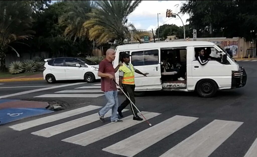 Hombre con discapacidad visual participante de la evaluación en Santo Domingo cruzando la calle con ayuda de un policía tránsito.Según el Reporte de Discapacidad y Desarrollo de las Naciones Unidas de 2024, el 43% de las personas con discapacidad en los países en desarrollo considera que el transporte no cumple con este requerimiento. A nivel mundial, solo alrededor del 70% de las estaciones y de las plataformas de tránsito, así como a las estaciones de autobuses, son accesibles para los usuarios de sillas de ruedas. Adicionalmente, un tercio de las personas con discapacidad informan que las instalaciones recreativas tampoco lo son; y el 28% informa que necesitan ajustes razonables para poder participar en la comunidad.