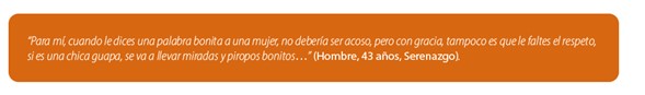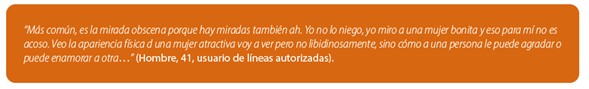 Los entrevistados en esta investigación consideraban que las miradas y los piropos, que son formas de acoso verbales, y gestuales podían ser malentendidos, y que la intención con la que se realizaban determinan si son o no un acto de acoso. Y la gran mayoría de los hombres señalaron que para ellos eran acciones válidas para interactuar con una mujer. Sin embargo, tanto las miradas y los piropos son formas de acoso y de las más comunes en el transporte público junto a los tocamientos y roces.
