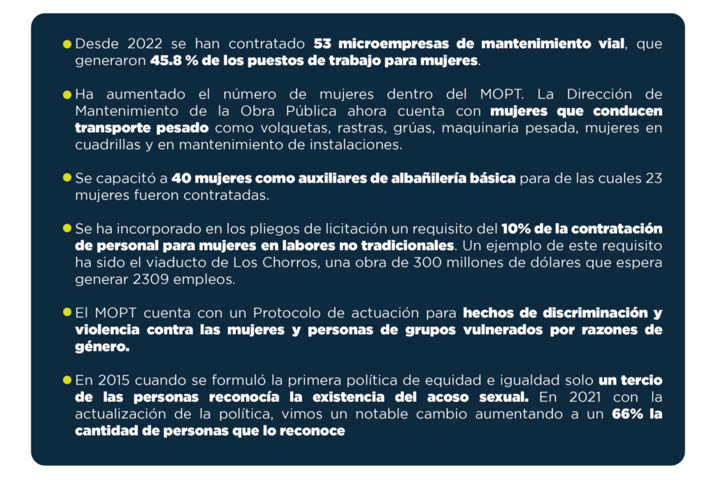 La nueva Política de Igualdad y Equidad de Género del MOPT es responsabilidad de la Unidad de Género de la Gerencia de Talento Humano y Cultura Institucional. Contempla cuatro ejes estratégicos, los cuales reflejan cómo aterrizar la voluntad política en acciones concretas tanto a nivel institucional como en los proyectos de infraestructura:
