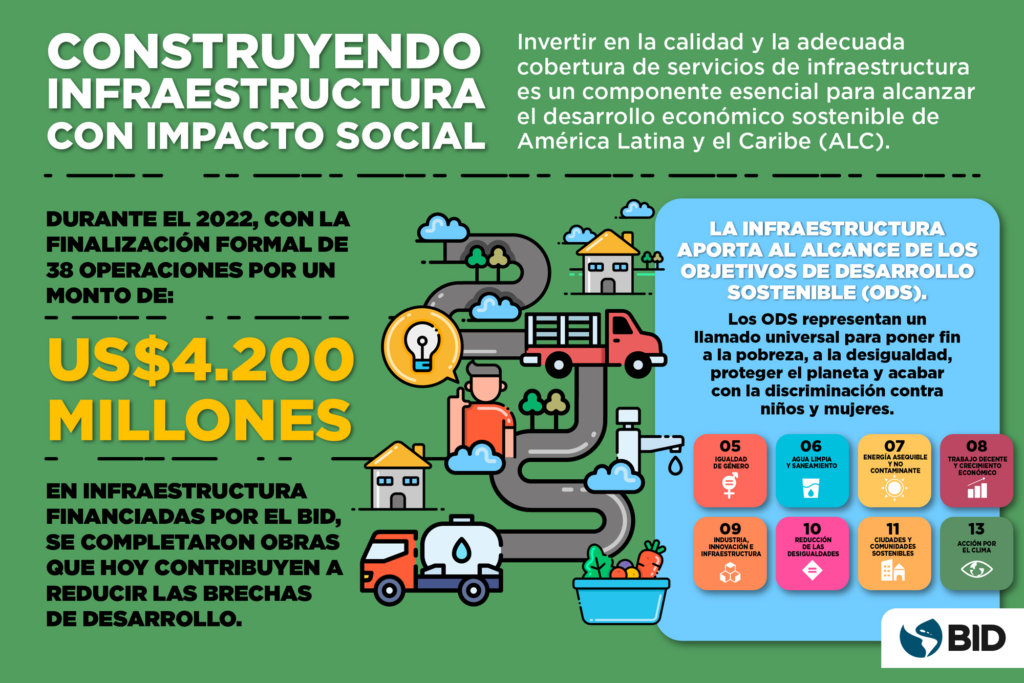 La infraestructura aporta al alcance de los Objetivos de Desarrollo Sostenible (ODS). Los ODS representan un llamado universal para poner fin a la pobreza, a la desigualdad, proteger el planeta y acabar con la discriminación contra niños y mujeres (Naciones Unidas, 2015). Para trabajar en este compromiso común, los gobiernos de ALC con apoyo del BID llevan a cabo acciones puntuales impulsadas a través del desarrollo de los proyectos de infraestructura, que contribuyen directamente con varios objetivos de desarrollo: ODS5 igualdad de género; ODS6 agua limpia y saneamiento; ODS7 energía asequible y no contaminante; ODS8 trabajo decente y crecimiento económico; ODS9 industria, innovación e infraestructura; ODS10 reducción de las desigualdades; ODS11 ciudades y comunidades sostenibles y ODS13 acción por el clima.