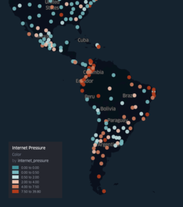 Velocidad promedio de descarga de datos (Mbps) y latencia (ms) en internetFuente: OOKLA Así mismo, el Índice de Presión de Internet (2) calculado por la empresa KASPR, también evidencia la disminución de la velocidad promedio de transmisión de datos en América Latina y el Caribe. La siguiente gráfica presenta los cambios porcentuales en la medición de velocidad entre el 13 de febrero y el 13 de marzo para diferentes ciudades de la región, donde se evidencia que en algunos sitios este índice aumentó hasta un 39%.