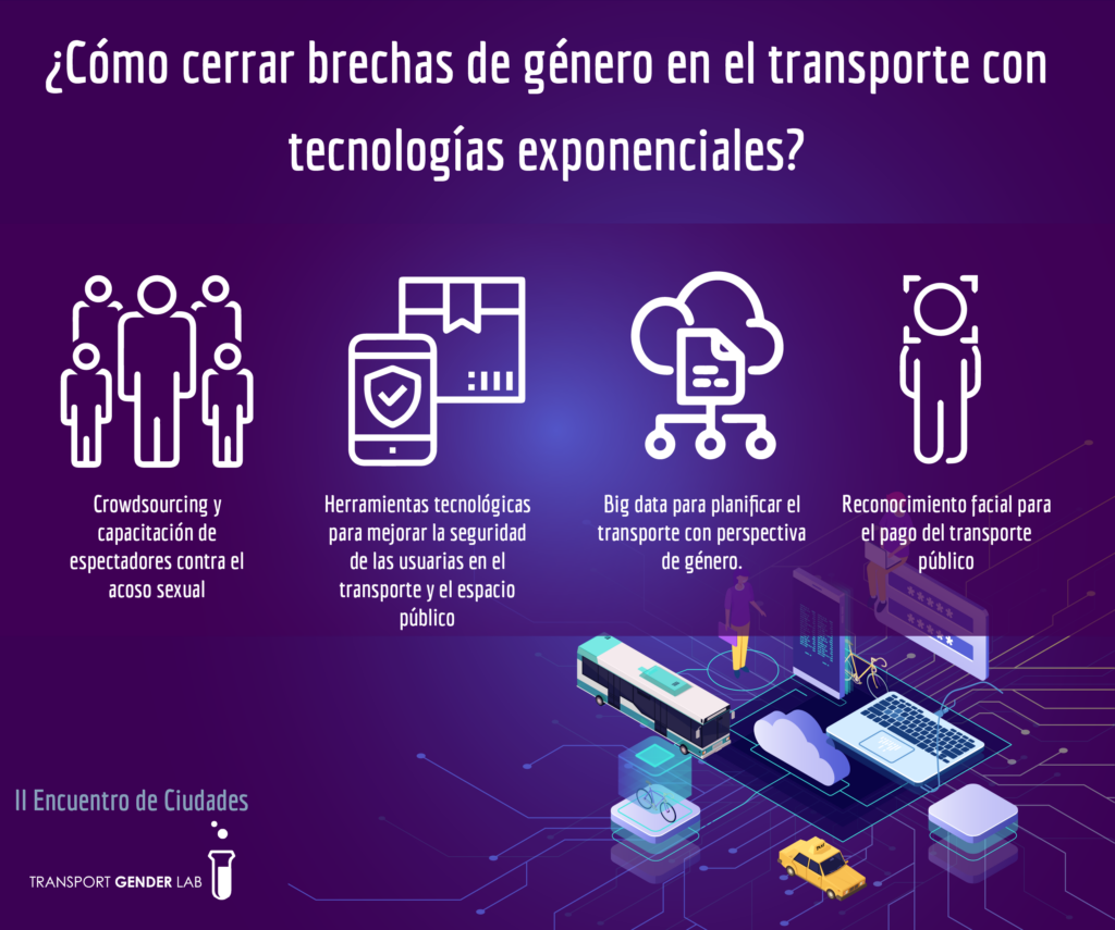 Herramientas tecnológicas diversas permiten a las ciudades crear iniciativas orientadas a la seguridad de las mujeres en el espacio y el transporte público. La organización Nina en Brasil, desarrolló una herramienta para que los gobiernos locales creen políticas públicas basados en datos de denuncias realizadas por medio de una aplicación reportando casos de acoso en el transporte público. La Secretaría Distrital de la Mujer en Bogotá empleó la herramienta de georreferenciación Safetipin para identificar los puntos de la ciudad de mayor inseguridad para las mujeres. El app Smart 912 ha sido fortalecido en San Salvador para incorporar una funcionalidad que permita reportar el acoso sexual en el espacio público. El App CDMX “Mi Ciudad Segura” agrupa funciones para reportar situaciones. Estas incluyen alertas inmediatas en caso de emergencia como el acoso sexual en el espacio y el transporte público.