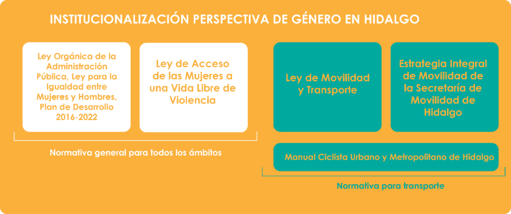 Este trabajo conjunto entre las instituciones del Estado, la sociedad civil, y expertos en la materia que se ejemplifica en la armonización del Manual Ciclista Urbano y Metropolitano de Hidalgo, busca entender las dinámicas de movilidad en bicicleta de hombres y mujeres. Ello ayuda a promover una institucionalización de una movilidad inclusiva. Temas como una movilidad activa libre de violencia basada en género y mecanismos de protección asociados; además del reconocimiento de la bicicleta como modo para realizar labores relacionadas con el trabajo del hogar, hacen parte de este mecanismo de institucionalización. El Programa de Ordenamiento de Transporte Convencional se encuentra en una etapa inicial de diagnóstico. Se espera analizar las encuestas desde una perspectiva de género.