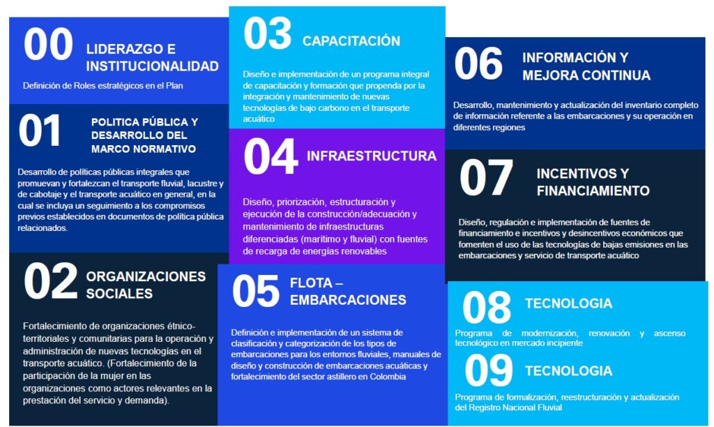 El plan propone acciones, ejecutables en el corto plazo, que permitirán fortalecer el marco normativo y la institucionalidad de los actores involucrados, con el objetivo de fortalecer y modernizar el transporte acuático. También se contemplan acciones para modernizar la flota, definir lineamientos para la construcción de infraestructura energética en puertos y sistemas de carga de energía para la reducción de emisiones de gases de efecto invernadero. Finalmente, las acciones buscan promover el uso de tecnologías más limpias y sostenibles.