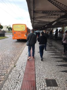 Según la primera parte de este blog, las barreras pueden ser físicas, operacionales, comunicacionales y actitudinales y son complementarias entre ellas. Los perfiles analizados nos facilitaron comprender mejor las acciones que el Banco puede impulsar para combatir estas barreras. En el caso de las barreras físicas, usaremos como ejemplo el trayecto diario de Julio quien es un joven activista del deporte paraolímpico. Julio toma tres buses y el viaje puede durar más de una hora. La pronunciada cuesta y la ausencia de aceras es evidente, para esto Julio se mueve en zigzag y por el medio de la calle, corriendo el riesgo de ser arrollado por algún vehículo, los cuales transitan por esta calle residencial a altas velocidades. Para el caso de personas que llevan sillas de rueda, la MVC identificó oportunidades de mejora en la infraestructura como: diseño y construcción de aceras paralelas y que estén a las intervenciones de la línea Inter 2; utilización de estándares de diseño universal para las aceras con énfasis en la continuidad de las rampas y utilización de superficies lisas y homogéneas; la implementación de cruces seguros, accesibles y para todo el acceso al transporte público; y mantenimiento de las infraestructuras del entorno urbano. Julio en su trayecto a la estación tubo. Foto tomada por Diana Sandoval A través de nuestra experiencia con João, quien tiene discapacidad visual, fue posible identificar otras barreras físicas presentes en el entorno. Durante el viaje, João tiene referencias establecidas que lo guían en los trayectos. Sin embargo, depende mucho de los medios tecnológicos (señales audibles) o de la ayuda de otras personas. Al igual que la experiencia de Julio, este usuario coincide en los desafíos que plantea la infraestructura, pero también la operación del sistema de buses: “Los conductores deberían parar en el mismo lugar, pues siempre paran en sitios diferentes, esto debería ser un criterio de conducción”. El área con losa podo táctil no está cubierta por lo que si llueve João no está protegido. Foto tomada por Juliana de Moraes Pinheiro