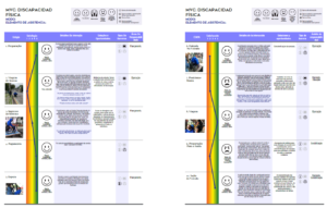 Flavia quien está dedicada al cuidado de su hijo de 11 años quien tiene trastorno del espectro autista, tiene un viaje de 11.74 km y duración de 46 minutos, con transbordos para que el niño pueda asistir a terapias físicas. La condición de su hijo lo hace vulnerable a las condiciones del ambiente (ruido, ocupación alta) y a la actitud de las personas (prejuicios, falta de empatía). Dado que la discapacidad del hijo no es evidente, tiene dificultades en lograr el cumplimiento de sus derechos, es difícil que dejen sentar al niño por que los usuarios y personal operativo de las estaciones y buses no entienden sobre este tipo de discapacidad. Flavia ha tenido que superar episodios de crisis de su hijo, sin mayor apoyo de las personas o del personal de operación, en esos casos ella desciende del bus con su hijo para calmarlo. Durante el acceso a la terminal se evidencio la actitud de un funcionario operativo el cual fue agresivo con ellos, señalando que el niño “no tenía ninguna discapacidad y no podía pasar por la puerta asignada a PcD”. Flavia y su hijo haciendo trasbordo. Foto tomada por Lauramaría Pedraza Las barreras actitudinales identificadas están compuestas por brechas en el uso correcto de la silla azul, la falta de asistencia y mejora del acceso de las PcD al bus. Existe una percepción mayoritaria de los participantes del estudio sobre la falta de empatía de los demás usuarios. En cuanto a las recomendaciones para superar esta barrera están las campañas de sensibilización y educación para la ciudadanía y para los operarios del sistema, esto en conjunto de una infraestructura adecuada y protocolos claros de operación se garantiza la autonomía de las PcD en los sistemas de transporte y entono urbano circundante. Mapa de Viaje de Julio, en las que se ilustra su percepción durante las 12 etapas del viaje. Imagen de elaboración propia.