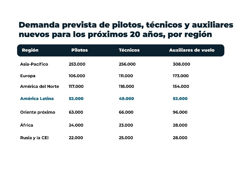 De acuerdo a la publicación especializada Boeing, para 2036 se visualiza una alta demanda de pilotos, auxiliares y técnicos, que se traduce a oferta laboral para aproximadamente 1.200.000 personas.