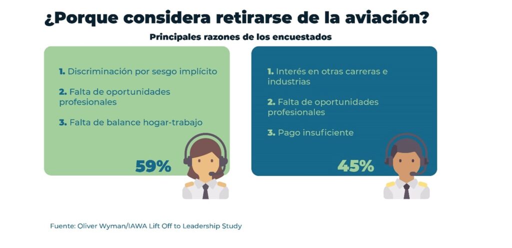 Una encuesta realizada por Oliver Wyman y la International Aviation Womens Association (IAWA) dio cuenta que las principales razones para abandonar la carrera de aviación. Las mujeres alegaban que existían: