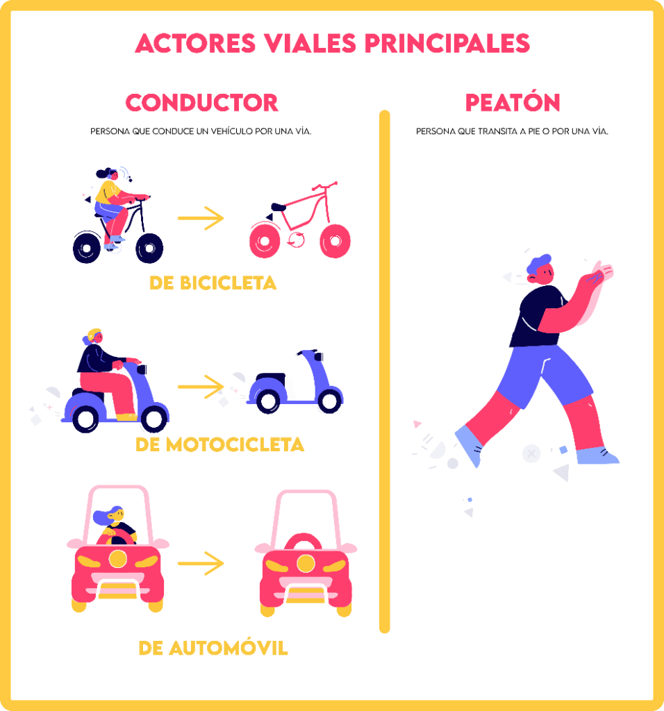 Existen dos actores viales principales: peatones y conductores, y para cada uno hay regulaciones y sobre ellos recaen sanciones. El usuario de bicicleta es conductor, porque “ciclista” está referido al deportista que practica ciclismo. Para el uso de la motocicleta también se generalizó el término “motociclista”, pero cuando está en su automóvil, si se le denomina conductor.