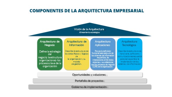 La arquitectura empresarial es análoga a la arquitectura de un edificio, entendiendo que las organizaciones requieren de ciertos elementos fundacionales, y sobre estos elementos se pueden construir distintos planos que deben interactuar y comunicarse para que la totalidad del edificio funcione correctamente. En primer lugar, se llevan a cabo una serie de diagnósticos de cada uno de los pilares a través de talleres participativos, y con base en esto se elaboran “planos” que abordan la Arquitectura de Negocio; la Arquitectura de Información; la Arquitectura de Aplicaciones; y la Arquitectura Tecnológica.